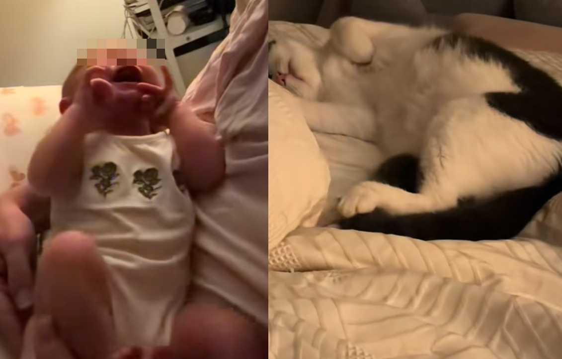 一對新手爸媽最近在TikTok上分享,當家中新生兒開始哭泣時,沒想到躺在附近的寵物貓立即有反應,像之前照顧自己的貓寶寶們時一樣,秒翻身露出肚子,試圖「餵奶」幫忙安慰寶寶。