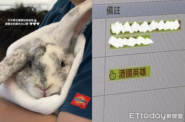 準備動手術的寶妮被醫生抱在懷裡,似乎知道自己對麻醉免疫所以特別淡定。寶妮媽媽留言表示,整個麻醉過程都讓獸醫超挫折,「劑量增加,眼睛還一直給他睜開」,而且這種案例極少見,一年大概只會有一次。自己下午接到電話趕來接兔兔回家,看見病例上的備註也笑翻,「酒國英雄什麼啦喂~」。