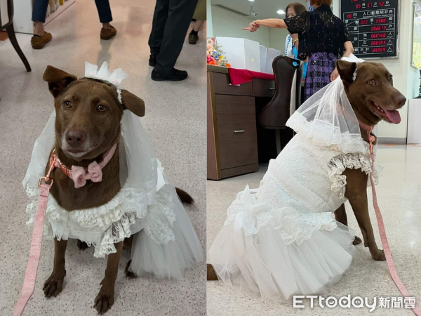 桃園市5歲的巧克力米克斯犬「林美祿」是全家的寶貝,也見證了叔叔嬸嬸結婚登記,爸爸偷偷讓牠穿上白色小禮服,「小花童」出現在現場時所有人都好驚喜,連現場的工作人員都頻頻稱讚,網友更是留言調侃「來搶婚了」!