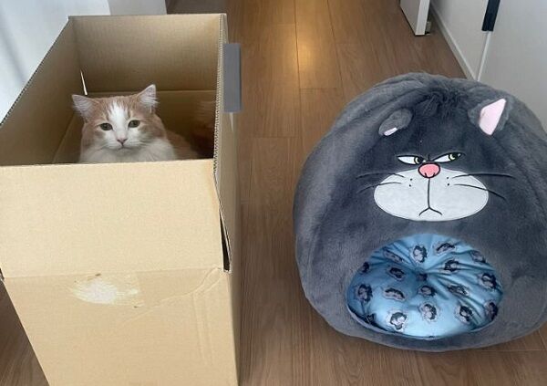 窩在裡面的毛茸茸博士眼神堅定,似乎已經認地這裡比較符合貓體工學,而旁邊昂貴的新房子依然空蕩蕩地乏貓問津。實際上這隻喵星人對貓窩的形式有著獨特的看法,除了箱子外牛皮紙袋也是個好選擇,偶爾還會霸占鏟屎官的透明資料夾當軟墊。現在牠堅定選擇紙箱的照片已在X累積超過208萬次點閱。