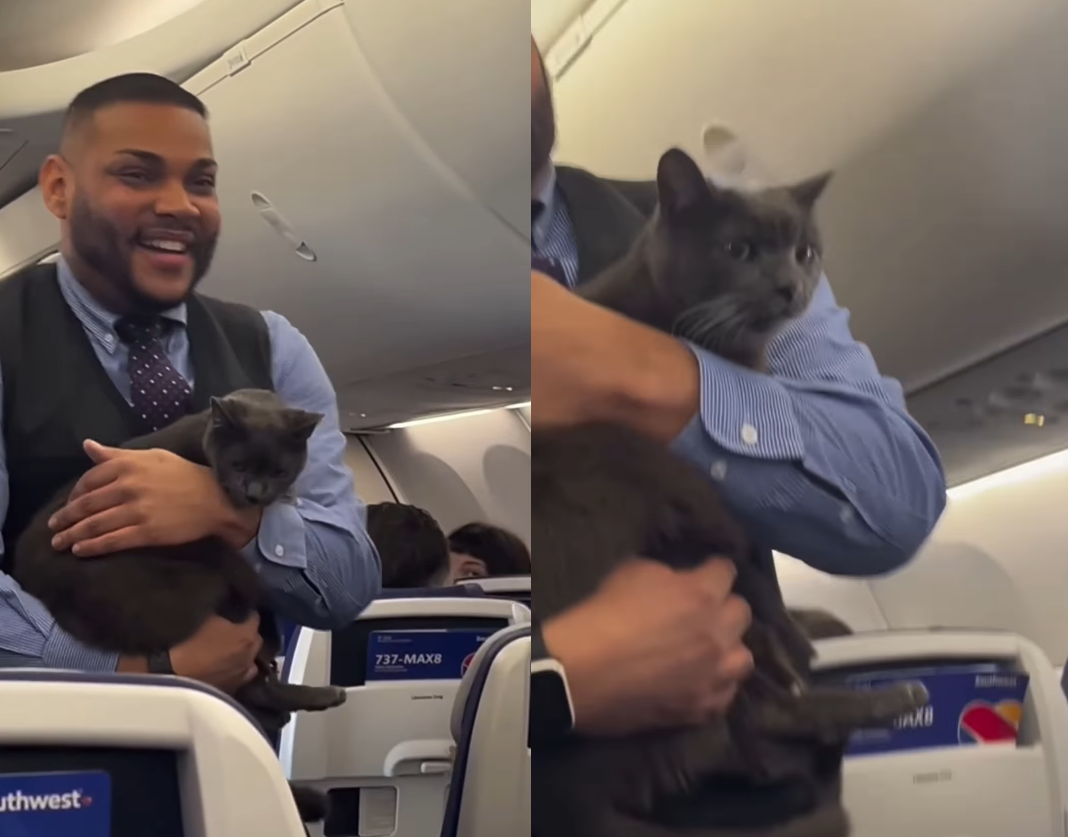 當時正是感恩節假期的航班,空服員注意到座位間有動靜,低頭一看竟發現一隻藍貓好奇地在機艙內探險。為了避免貓咪受驚或影響其他乘客,空服員輕輕將牠抱起,彷彿抱著嬰兒般小心呵護。