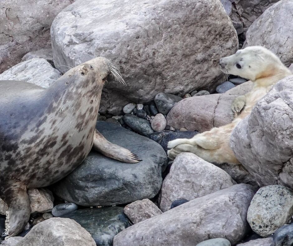 今年Kale帶來更大的驚喜,再次捕捉到牠的身影時,身邊竟然多了一隻小海豹!小海豹還覆蓋著白毛,救援團隊為牠取名為Amethyst,與媽媽一起生活在熟悉的海域。