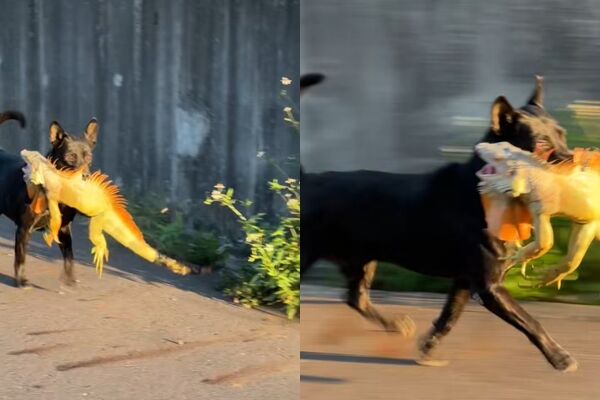 從民眾拍攝的畫面中可以看見,黑色的狗狗嘴裡叼著一隻綠鬣蜥在路上狂奔,時不時還轉頭盯向鏡頭,腳步看起來十分雀躍。