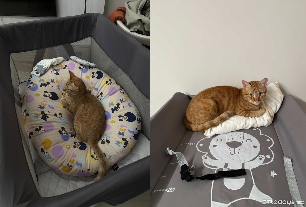 Zoe表示,養了米糕之後,買過很多貓咪的玩具、睡墊,但米糕全部都打槍,只喜歡躺在人的床上,後來寶寶出生添購許多嬰兒用品,沒想到米糕似乎把自己也當成嬰兒了,特別喜歡寶寶的玩具、睡床,甚至連尿布檯都變成牠的睡覺基地,看牠睡得這麼舒服的樣子,總是讓奴才又無奈又好笑。