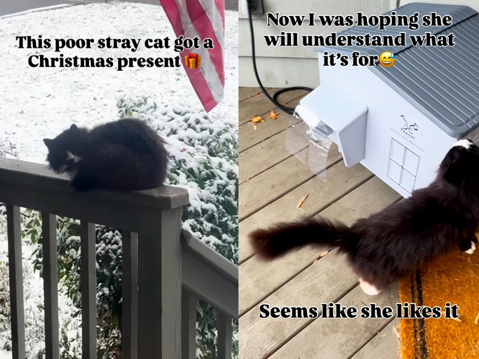 影片中可看到,禮物剛好在聖誕節前夕抵達,她為流浪貓買了一間附有暖氣的寵物小屋,為了讓小貓願意進去,還特別使用食物引誘,小貓一開始雖然有點困惑,幸好後來似乎非常喜歡,漸漸把小屋當成自己的家。