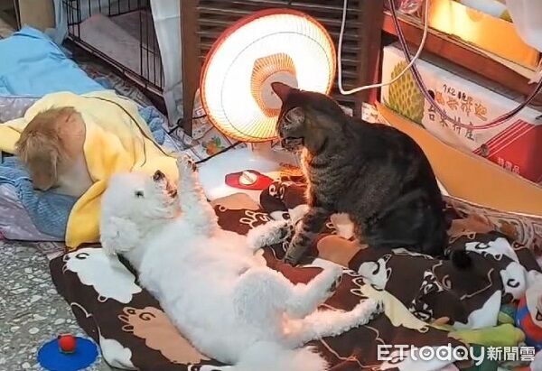 粉專「狗奴腸腸遇到貓」經常紀錄家中一貓二狗的日常。這天比熊妹「卷卷」正躺在電熱扇前最舒服的地方睡覺,但虎斑哥哥「胖福」也看上了同個位子。雙方上演了一場無聲的爭鬥,結果卷卷因為手太短,每次都揮棒落空被哥哥壓制。