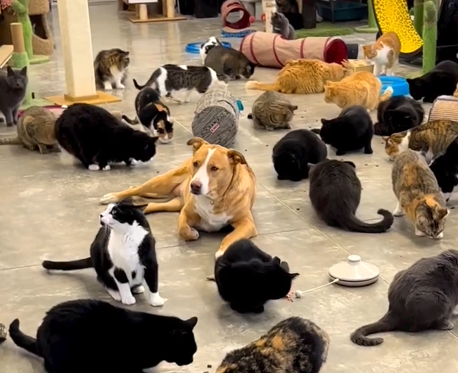 美國明尼蘇達州收容所Furball Farm Cat Sanctuary收容超過350隻貓咪,其中有一隻看起來「不太對勁」,原來那是一隻叫做Bella的狗狗,牠堅持要跟貓咪待在一起,一開始工作人員也緊張貓狗大戰,不過Bella跟貓咪們處得出奇地好。
