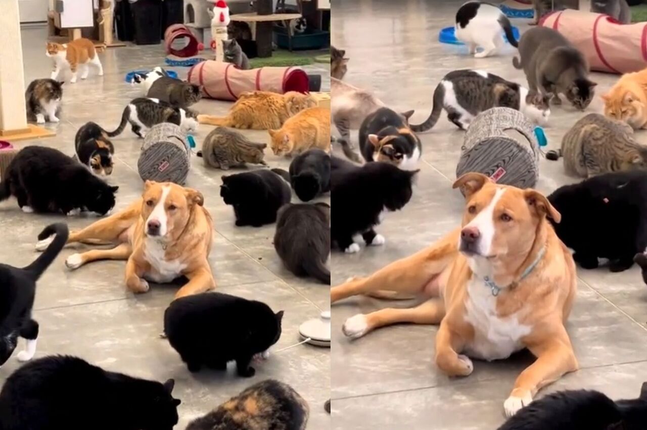 在美國明尼蘇達州的一間貓咪收容所裡,住著超過350隻曾經是流浪貓的「居民」。但當訪客走進貓舍時,往往會被眼前的景象驚呆——在一片貓海中,竟然躺著一隻體型巨大的狗狗!這隻名叫「貝拉」(Bella)的狗狗不僅沒被貓群排擠,還深受貓咪們喜愛,牠甚至學起貓咪「收手手」,模樣超級可愛!
