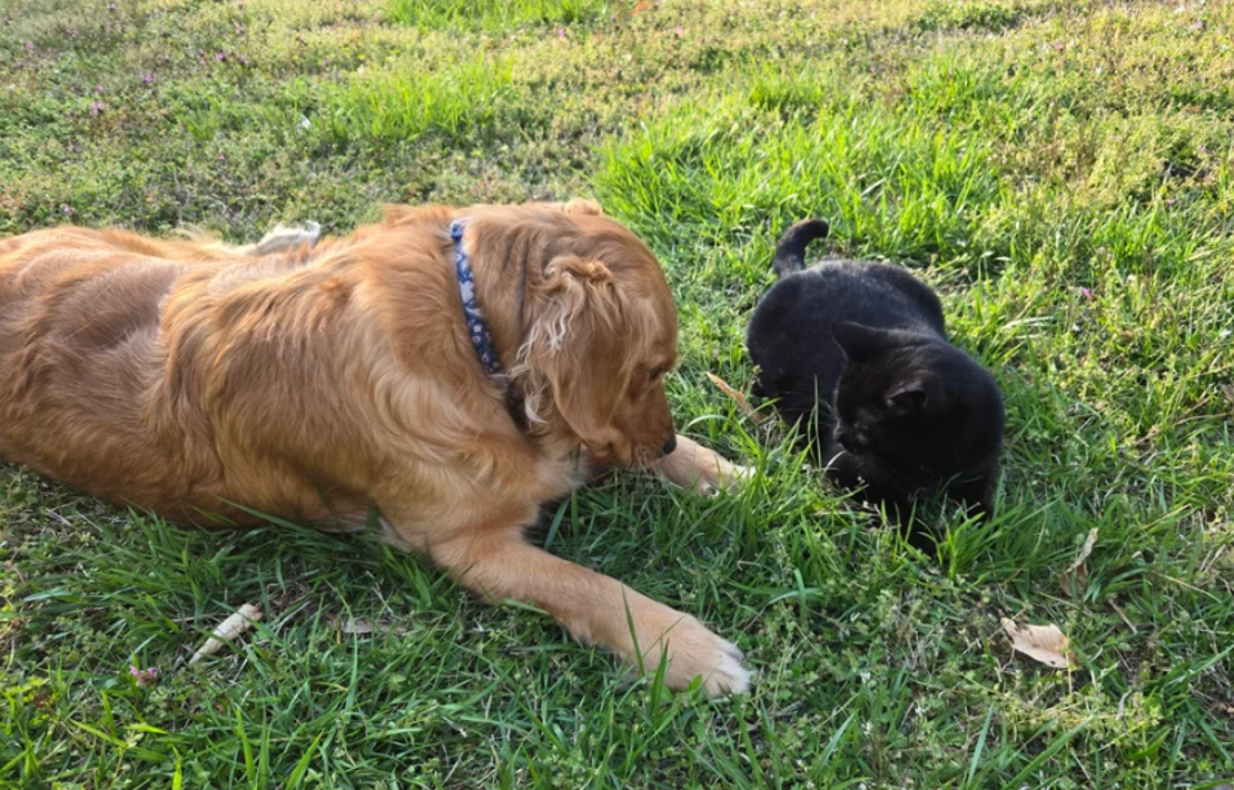 國外一隻黃金獵犬和一隻流浪黑貓成為朋友,難得的跨物種友情在網路上爆紅。主人分享,家附近出現一隻流浪小黑貓,小黑貓原本很怕生,不願意靠近任何人,卻在家中黃金獵犬的耐心下被收服,每天形影不離。