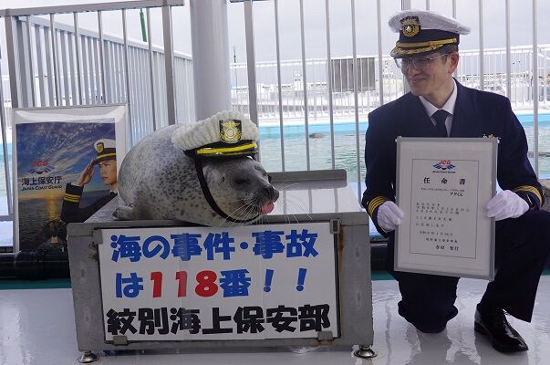 北海道的紋別海上保安部,最近迎接了一隻名叫阿古(アグくん)的海豹新人,主要擔任保安廳的宣傳大使。為此他們還特地為這位新夥伴舉辦了一場小小的就職儀式,阿古似乎也決定以輕鬆的態度開始工作,上台時還俏皮地吐了吐舌頭。