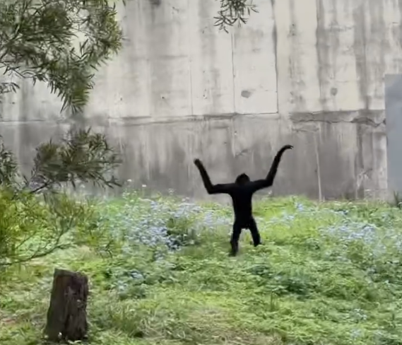 六福村的長臂猿高舉長長的手臂,雙腳在草皮上小跑,接著攀附在內舍門的欄杆上往裡頭看,接著又舉著手手往回跑,一瞬間就爬到樹上,@yyy_shan__見到這個畫面覺得太可愛了,隨手PO上Threads,沒想到獲得廣大迴響。