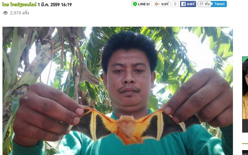 有看過「嫩黃色」的蝙蝠嗎?泰國中部素攀武里府有民眾在香蕉園中發現一隻色彩鮮艷的蝙蝠,這隻就算張開翅膀也只有10公分大的小蝙蝠,通體都是粉嫩的黃色,唯有翅膀上有著黑色的斑紋,模樣比起一般的蝙蝠要令人印象深刻。