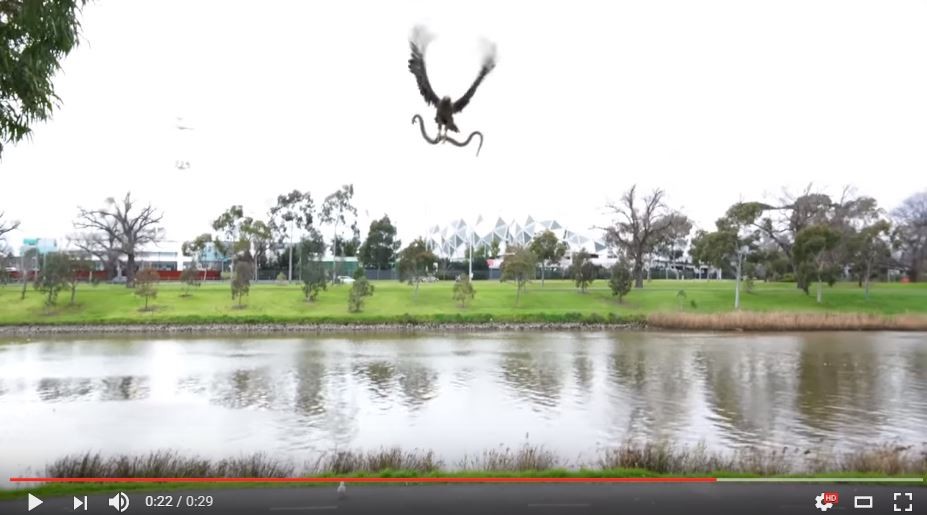 拍攝者是名黃姓華人(Douglas Wong),日前和家人前往雅拉河(Yarra River)附近烤肉,拍下老鷹沿著河邊的雜草飛,這時大家都還在欣賞牠翱翔的英姿,不久似乎是抓到一條蛇,竟然還朝他們丟下,只聽見影片中大喊快跑,蛇也在地上爬行離開。