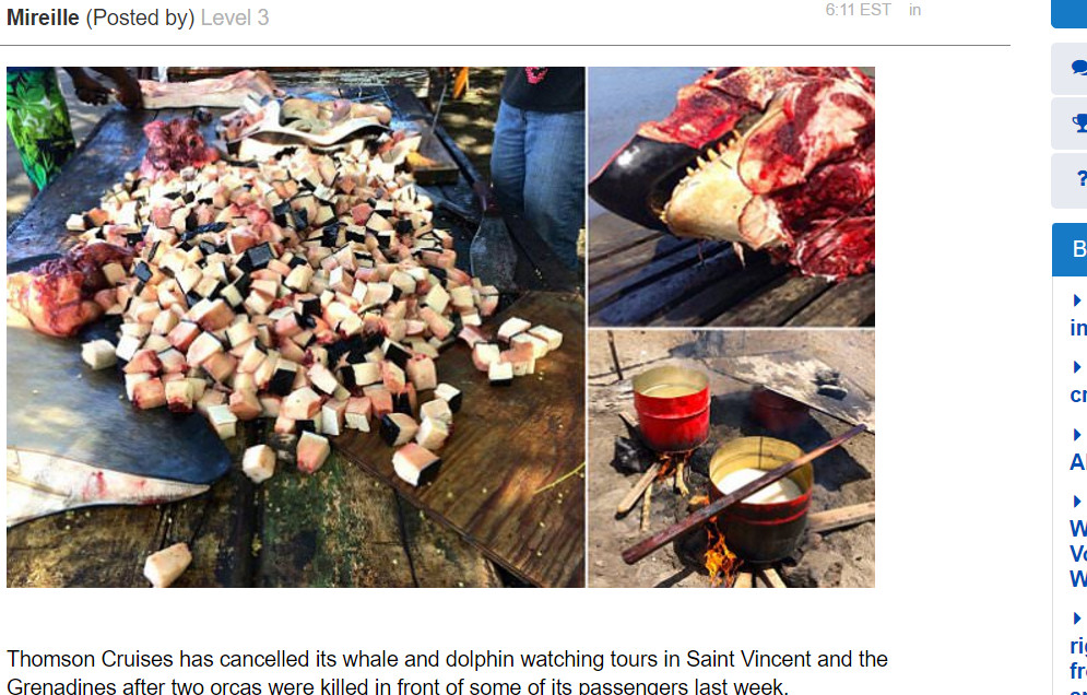 賞鯨郵輪Thomson Cruises上周帶遊客造訪聖文森及格瑞那丁(Saint Vincent & Grenadines)這個國家時,竟然親眼目睹當地漁民用魚叉將兩隻虎鯨給殺害並拖上岸,更恐怖的是,他們當場肢解,切成方塊狀,將頭部切得只剩眼睛和牙齒,並且提煉出鯨油,準備高價賣給市場。