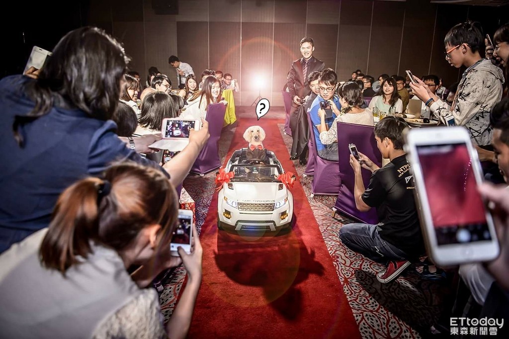 布魯媽說,那天是結婚宴客的日子,他們安排牠當作新郎新娘第二次進場的開頭,等牠走完就跟著進場發小禮物,「他一進場就聽到歡聲雷動的驚呼聲和掌聲,接著就聽到婚禮主持人介紹完他後不停地請大家讓條路讓他繼續前進,因為大家都爭先恐後的要上前拍照、錄影,也都很好奇他怎麼開車的!其實是後面舅舅在偷開,哈哈!」