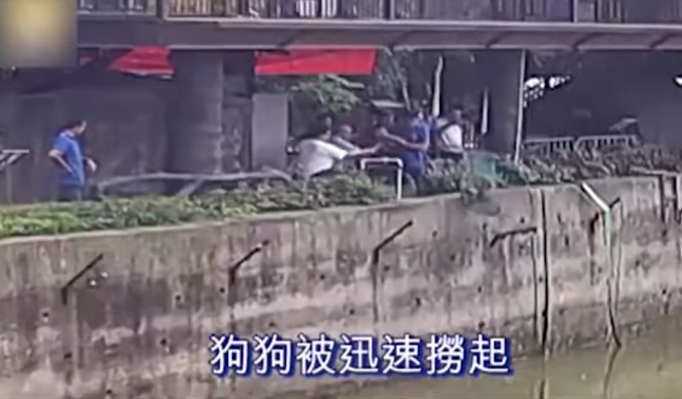 不料,一個手滑,主人就不慎讓抱在手中的愛犬跌落虎園池,馬上招來2隻東北虎走到池邊虎視眈眈,工作人員立即反應,使用鞭炮攻勢驅趕老虎,並快速用網子將狗捕撈拉起。