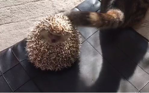 推特帳號「TGMR_hedgehog」發布的影片中,可以看到刺蝟躺在墊子上,一旁有隻貓咪背對著牠,尾巴不斷甩阿甩的,一下子從腳掃過頭,一下子從頭掃過臉和肚子,一下子又從左側狂擊,逼得牠只得把身子越縮越緊,變成一顆愛玉球。