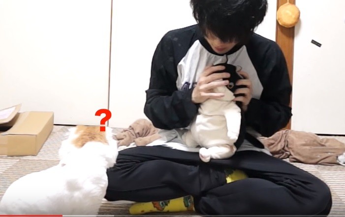 ▲測試貓咪會不會吃醋的實驗,貓咪一頭霧水不知道主人在幹嘛。(圖/翻攝自YouTube/ワタナベマホト)