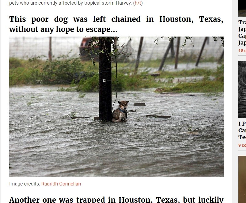 許多休士頓人流離失所,忙著逃離受創的家園,動物們更是慘遭遺棄,災情照片裡出現一幅一幅心碎的畫面。有人目擊一隻發抖的小狗,被繫繩綁在電線桿上,周圍是下著大雨漲起來的洪水,只能用無助的眼神望向攝影者,畫面令人驚心。