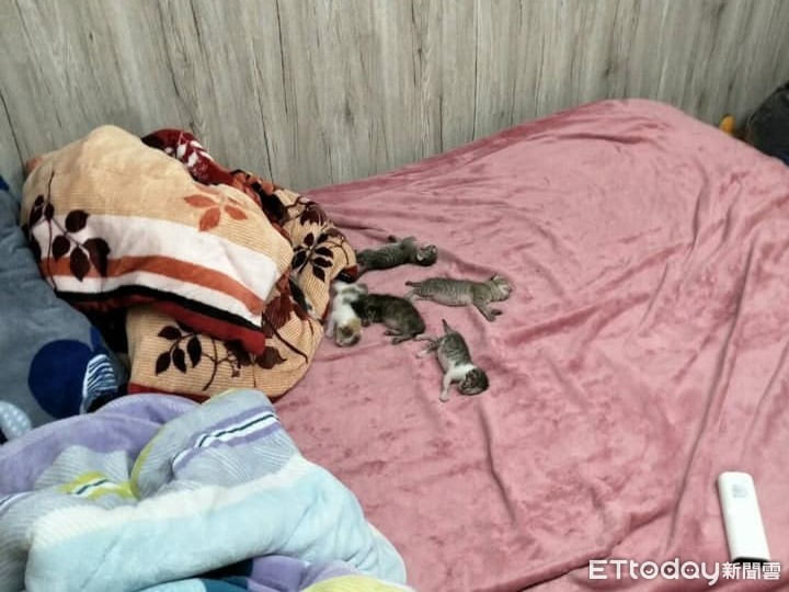 屏東網友蕭仲宏長期餵養一隻浪貓媽媽,這天他臨時有事外出,忘記關門,回到房間竟看到5隻小幼貓散在床上,仰著肉肚甜睡,他當下看貓咪在床鋪上翻滾,睡得相當舒服,覺得很可愛,但還是忍不住想說,「也太舒適了吧!」(ETtoday寵物雲有IG了,快按追蹤:https://goo.gl/MyKwZB)