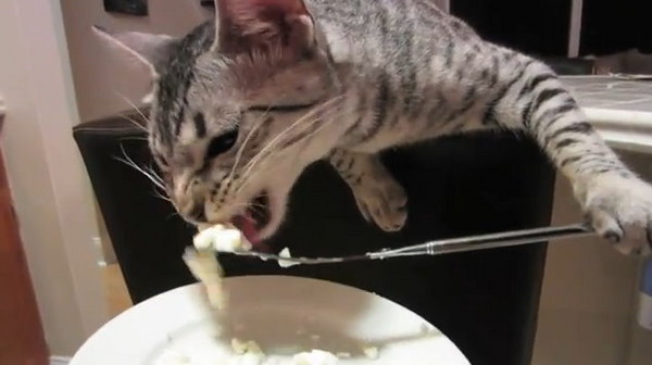 看影片/這隻好吃的餓貓真的「使用叉子」