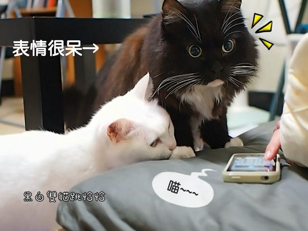 不久前被主人KUSO成《貓咪甄環傳》的「黑白雙貓跳恰恰」阿麵與塔克,近來也跟上流行,試玩貓奴間熱門話題的APP「人貓交流器」。它聲稱可將人話轉換成貓語,但實際上是針對你的聲音進行音頻分析,轉化成貓叫聲,因此意思不見得相通,卻能變成道地的喵喵聲。