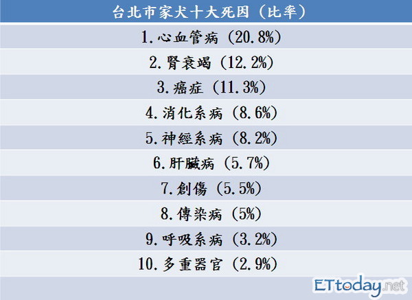 前3名都是慢性疾病,傳染病只占5%,動保處指出,這顯示台北市動物醫療有相當高的水準。台北市民飼養的寵物密度高居全台之冠,家犬逾16萬隻,家貓8萬多隻,動保處長嚴一峰建議,犬隻最好在7歲時進行例行健檢,並接受家庭動物醫師專業建議,早期預防早期治療。