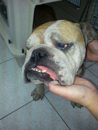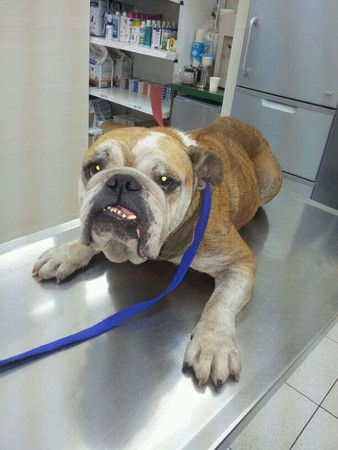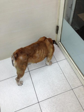 送醫檢查發現,牠已經生育過多次,乳房下垂。而心絲蟲檢查結果呈弱陽性,有貧血狀況,無外傷,體型瘦弱見骨,所幸3天後焦蟲檢驗報告陰性過關,飲食排泄皆正常。若持續治療和調養,有希望恢復承一隻健康可愛的英鬥犬!