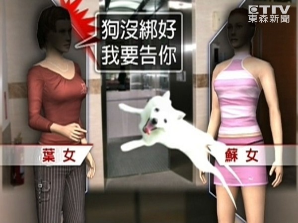 高雄市一名蘇姓婦人帶著寵物狐狸犬搭電梯,因為沒幫狗繫上牽繩,嚇到一名葉姓女鄰居,被告上法院。法官認為狐狸犬屬小型寵物,法律也沒有強制規定繫上牽繩,加上蘇女並非故意或縱容愛犬嚇人,判決飼主免罰。