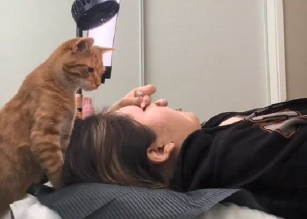 朱尼將鏟屎官的大腿當腳踏墊,親自對顧客的臉進行突擊檢查,仔細媽媽做的睫毛是否完美。但牠大部份時候都會選擇坐在瑪莉懷裡監工,用毛茸茸的身體療癒奴才心靈。錄下這一切的飼主也認為貓皇的行為非常有趣,「只是吵鬧的小貓在檢查媽媽有沒有梳好所有睫毛」。