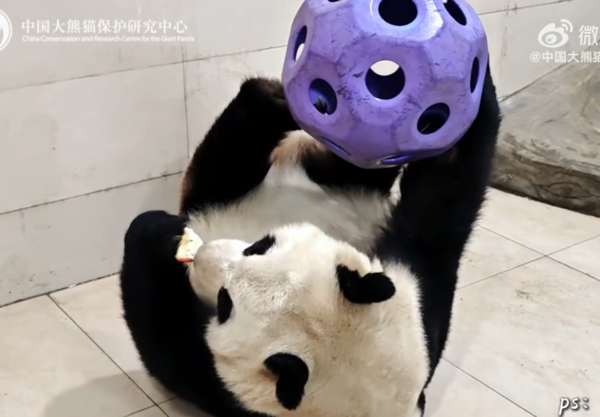 ▲福寶練就邊玩球、邊吃蘋果的功夫。(圖/翻攝自微博@中國大熊貓保護研究中心)