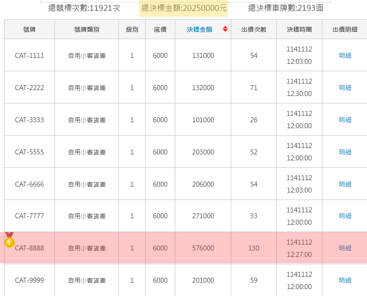 除了 CAT-8888 成為標王之外,此外連續數字被列為「一級車牌」,起標底價為6000元,其餘7組也開出高價,「CAT-1111」以13萬1000元得標、「CAT-2222」以13萬2000元得標、「CAT3333」以10萬1000元得標、「CAT-5555」以20萬3000元得標、「CAT-6666」以20萬6000元得標、「CAT-7777」以27萬1000元得標,而「CAT-9999」則以20萬1000元得標。