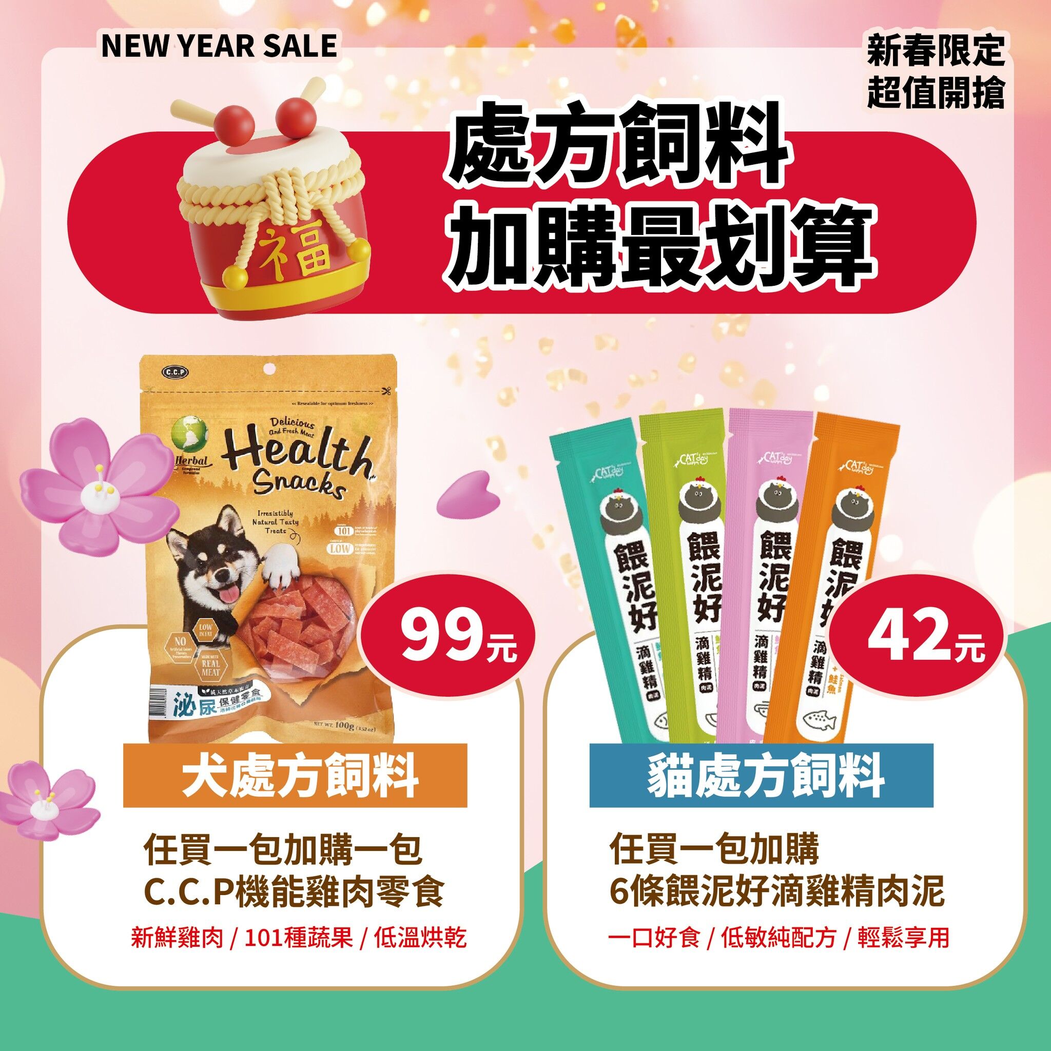 在處方飼料族群方面,活動規劃加購優惠:購買犬用處方飼料任一包,可用99元優惠價加購 C.C.P 機能雞肉零食一包;購買貓用處方飼料任一包,則可用42元加購滴雞精肉泥6條,強調在遵循醫療建議的前提下,也兼顧毛孩日常適口性需求。