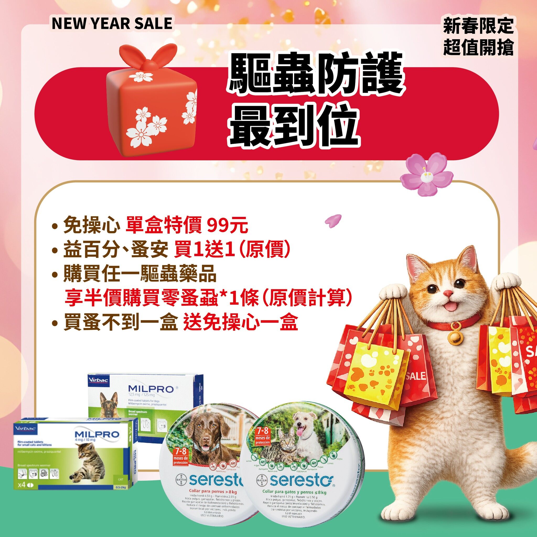 驅蟲防護則同步推出多款方案,包含指定品牌買一送一、指定藥品半價加購,以及單盒 99 元「免操心」等,讓飼主能依生活環境與風險評估,建立更完整的防護規劃。