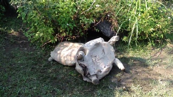 至於象龜「即刻救援」對底是什麼回事呢?原來在影片中,木柵動物園非洲區有一隻象龜四腳朝天,這時另一隻象龜緩緩走到「翻船」的同伴旁邊,開始設法營救牠。