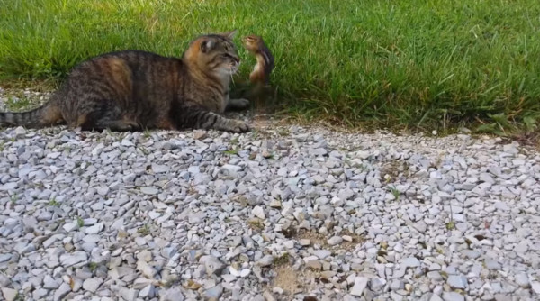影片一開始可以看見,一隻深色條紋貓叼著一隻花栗鼠緩緩走著,然後便把牠緩緩放下似乎正準備吃牠,或是與牠嬉鬧。而被叼著的花栗鼠顯然心情非常不好,抓到機會就馬上掙脫控制立刻跑開,但是才跑沒幾步,牠顯然不甘心逃跑,竟回頭挑釁條紋貓,當著條紋貓的面就直接往牠頭上跳,雙方展開激烈搏鬥,花栗鼠還一度被撲倒,但最後還是安全的逃離現場。