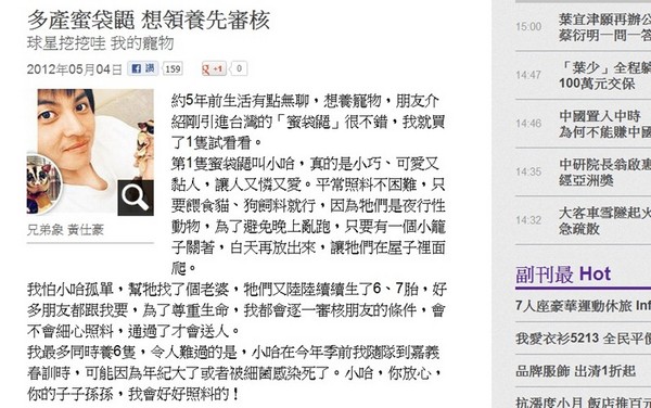 《ETtoday 寵物雲》接獲讀者投書,指出球員黃仕豪日前在《蘋果日報》分享的蜜袋鼯飼育經觀念錯誤,包括餵食貓狗飼料、讓牠多產(生了6到7胎) 、關籠等等,希望本報宣導正確的飼養方式。網友批評,「黃仕豪的飼育經簡直是誤導民眾,殘害更多蜜袋鼯,小蜜要更多的細心與照顧,食譜有分BML和HPW等。」、「狗貓飼料很油很鹹不適合小蜜,牠們比較適合吃天然的東西,唉,請多爬文吧!」也有人質疑,養到細菌感染死亡,恐怕是沒有定期健康檢查,或是飼養環境髒亂。