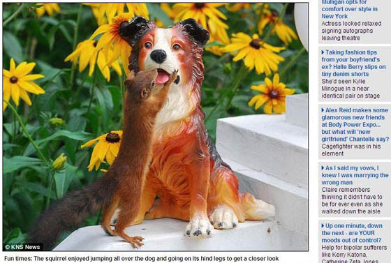 ▼紅松鼠激吻狗雕像。(圖/Daily Mail)
