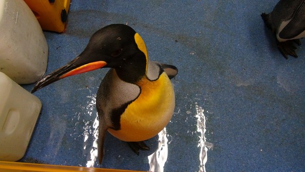 開始換羽的國王企鵝,會被安排住進後場的專屬「更衣室」,往更衣室內看,常會注意到這隻脖子上還殘留一些沒有脫落的羽毛;另一隻則像衣服才「脫了一半」。剛開始準備換裝的企鵝,通常羽毛蓬鬆,整隻看起來胖嘟嘟的,換好裝的企鵝總能重現超完美流線體型。