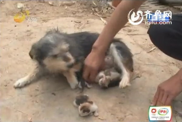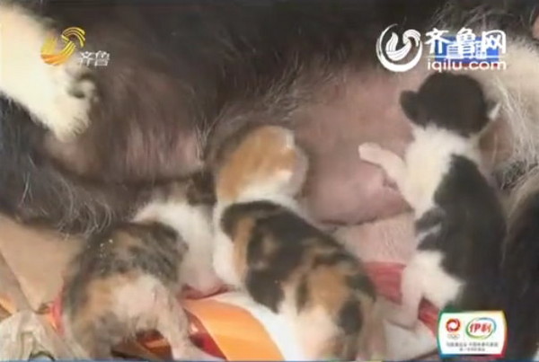 山東省德州市臨邑縣高相謙村,最近出了一件「奇事」,村民王文平家養了5年的母狗,竟然「生」了三隻小貓,只見狗媽媽餵三隻小貓吃狗奶,狀甚慈藹,可見養育的恩情大過親生。