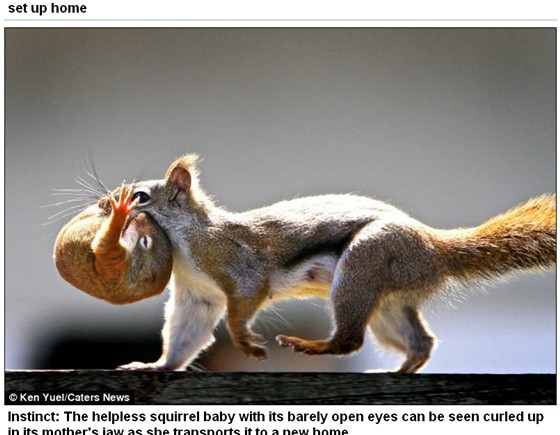 加拿大曼省溫尼伯市一名屋主Ken Yuel原本讓紅松鼠一家住在花園內的小木屋,沒想到園藝的工作卻讓松鼠媽媽感到威脅,下定決心遷移,將孩子一隻一隻叼進嘴裡,在籬笆上來回奔走好幾趟,才將7隻松鼠寶寶遷移到安全的新家。