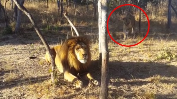 影片中,尚格慵懶地趴在草地上、眼神直盯著前方的攝影機,模樣看起來十分威風。不過,另一隻母獅沙妮卻悄悄出現在畫面右方,就像是要狩獵一樣小心翼翼地往前進,走到尚格後方時還調皮地看了一下鏡頭,似乎是要拍攝者不要「露餡」,接著伸出前腳輕拍一下公獅的屁股,嚇得對方馬上發出一聲低吼並從原地跳起來。