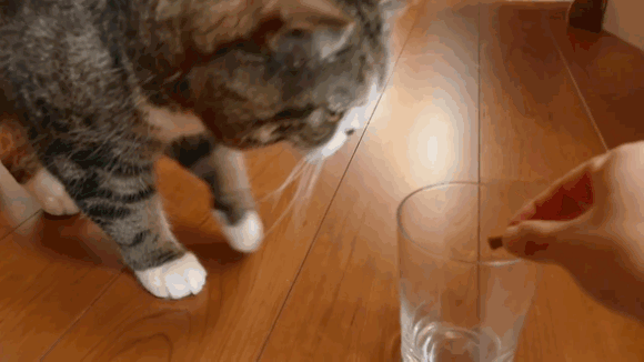 看到玻璃杯裡的貓糧,小花毫不遲疑地把左掌伸進去;而搞笑的小圓決定牠的臉是最適合的選擇。