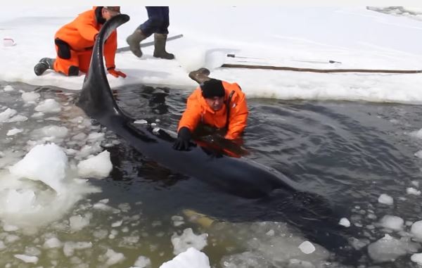 ▼俄羅斯搜救隊正救援一隻受困的虎鯨。(影/翻攝自YouTube)