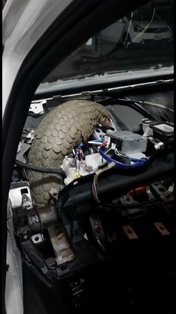 照片中,可以看到在車子的擋風玻璃前,儀表等面板已被拆開,露出內部線路和零件,而金黃色的穿山甲就「卡」在裡面,長長的尾部則露在外面。照片一PO上網,立刻引來網友驚呼「太誇張」、「怎麼會在那裡」、「怎麼跑進去的啦!」