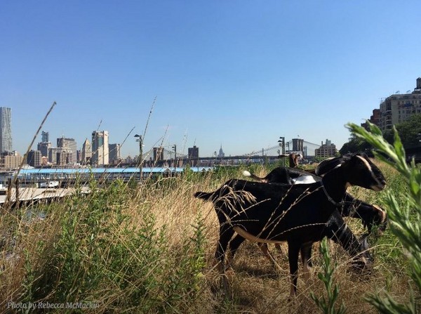 紐約布魯克林大橋公園近日(Brooklyn Bridge Park)捨棄電動除草機,請來了4隻奴比亞山羊(Nubian goats)擔任令人意想不到的「除草特工」,牠們只要負責「吃」就能完成工作了。公園管理員蕾貝卡(Rebecca McMackin)表示,「把公園交給牠們沒問題,我們絕不使用人工除草劑,而山羊就是最適合、最可愛的選擇。」
