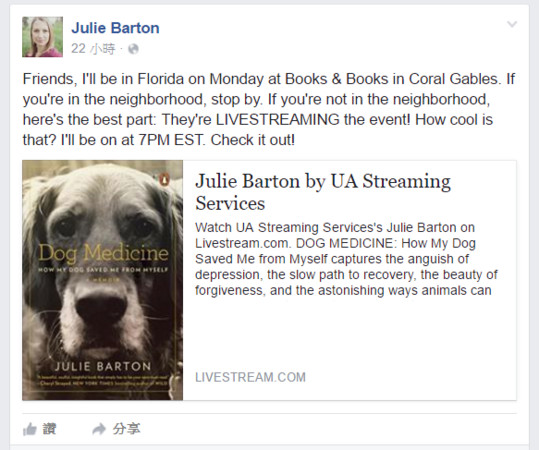 狗狗真的是人類最好的朋友,甚至在主人心情不好時,陪伴身旁不離不棄!美國一名作家朱莉巴頓(Julie Barton)在年輕時患有抑鬱症(clinical depression),在她人生最低潮、黑暗的時候,遇到一隻黃金獵犬邦克(Golden Retriever Bunker)後改變了她的生活,並克服抑鬱症的難關。朱莉稱,「邦克是我活下去的唯一理由。」