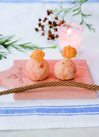 5 白花椰菜洗淨,切下一小朵(一顆白花椰菜約可分切20朵),插入雞肉球的頂端。