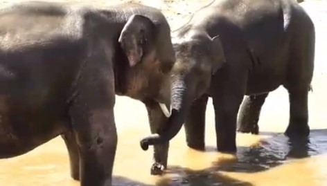 天氣再熱也要玩得過癮!美國奧勒岡動物園日前在臉書粉絲專頁PO出一段影片,工作人員直播完亞洲象薩穆德拉的泥巴浴之後,另一隻大象莉莉也跑過來一起玩耍,2隻大象在泥巴池中打滾,最後還面對面互相蹭了一下,長長的鼻子也捲在一起,看起來感情十分要好。