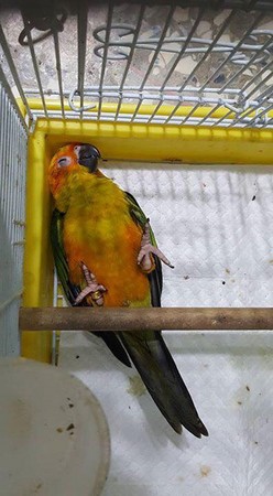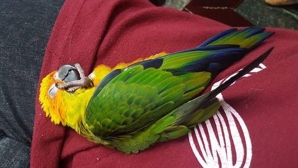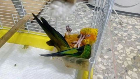 這組照片中,可以看到這隻金太陽鸚鵡有著超誇張的睡姿,除了躺著露出橘黃色圓肚外,還有一邊側躺、一邊用腳抓著自己喙部,更誇張的是背部朝下、雙腳朝天,把自己塞進飼料盆裡的「糾結睡姿」,讓飼主疑惑「你就不能好好睡覺嗎.....?」